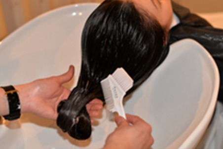 最初はシャンプーで汚れを落とし、トリートメント前のベース作りです!!髪全体にしっかりと水分を行き渡らせ、シャンプーの泡成分を髪に入れ込んでいきます!!